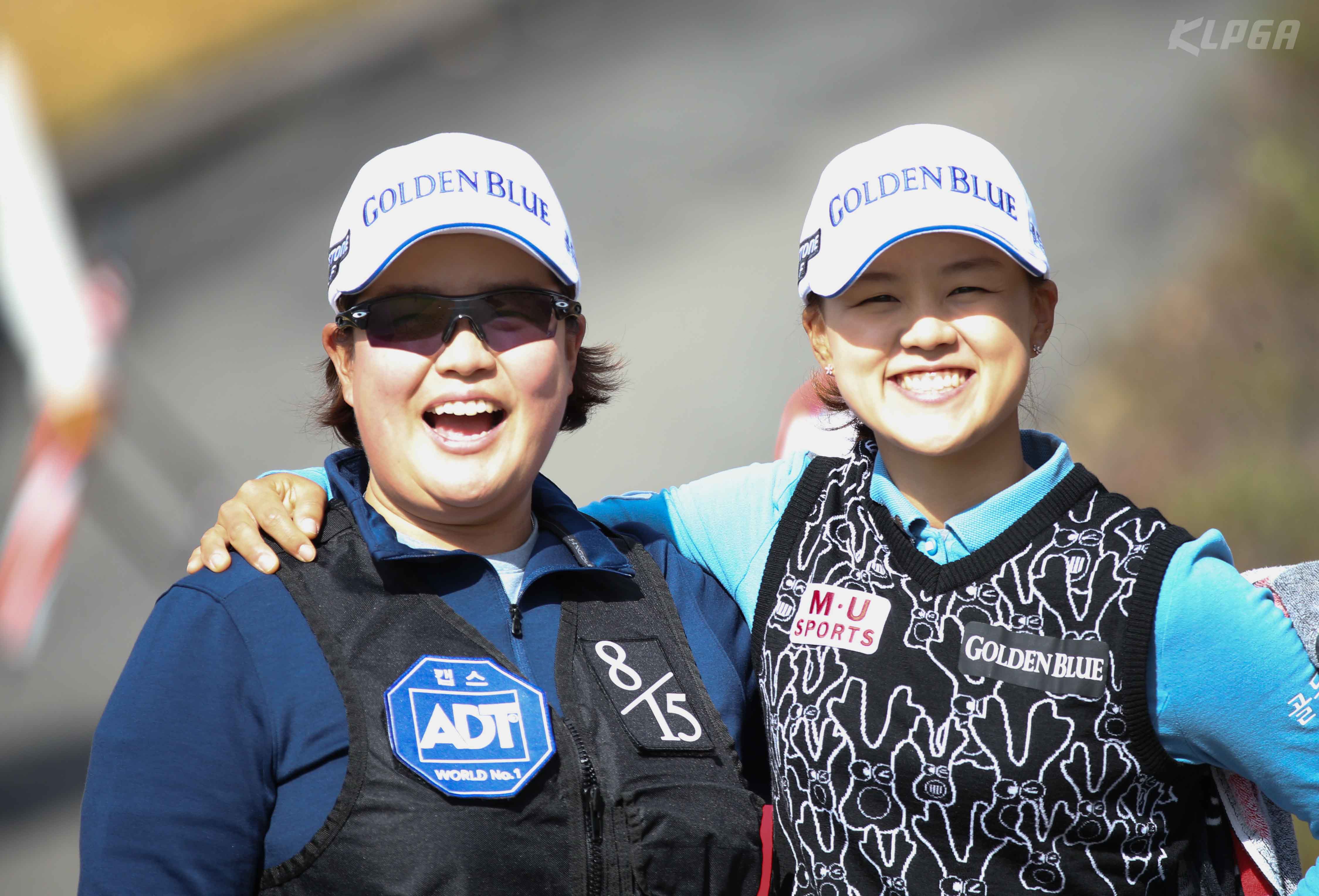 최유림과 캐디 조아람이 9번홀 티샷전 밝은 표정 짓고 있다